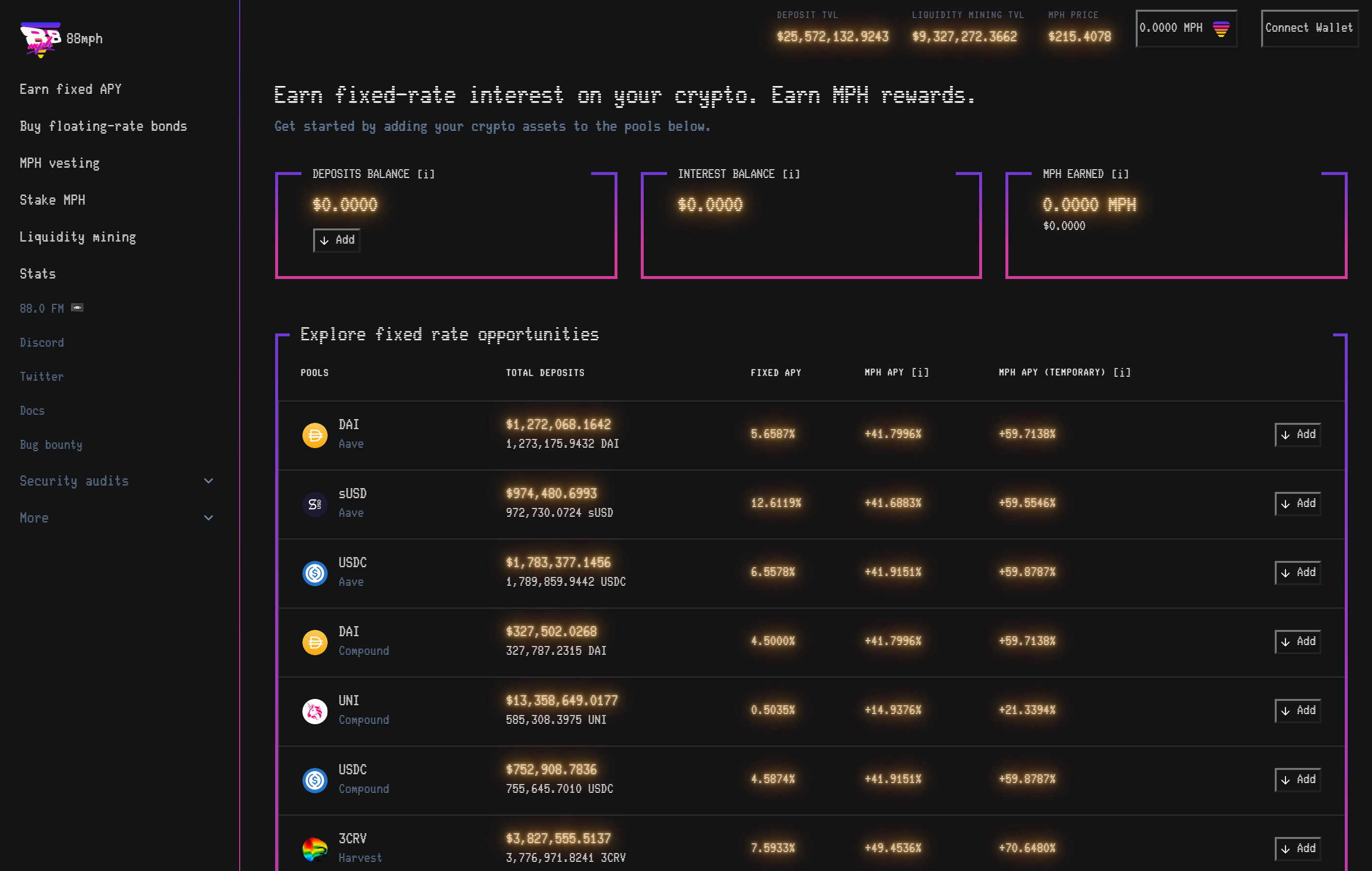 Since October 2019, we geared our focus on 88mph.app. It’s an Ethereum protocol allowing you to lend your crypto assets at a fixed interest rate or buy some floating-rate bonds. By doing so, you earn upfront $MPH token and system rewards.