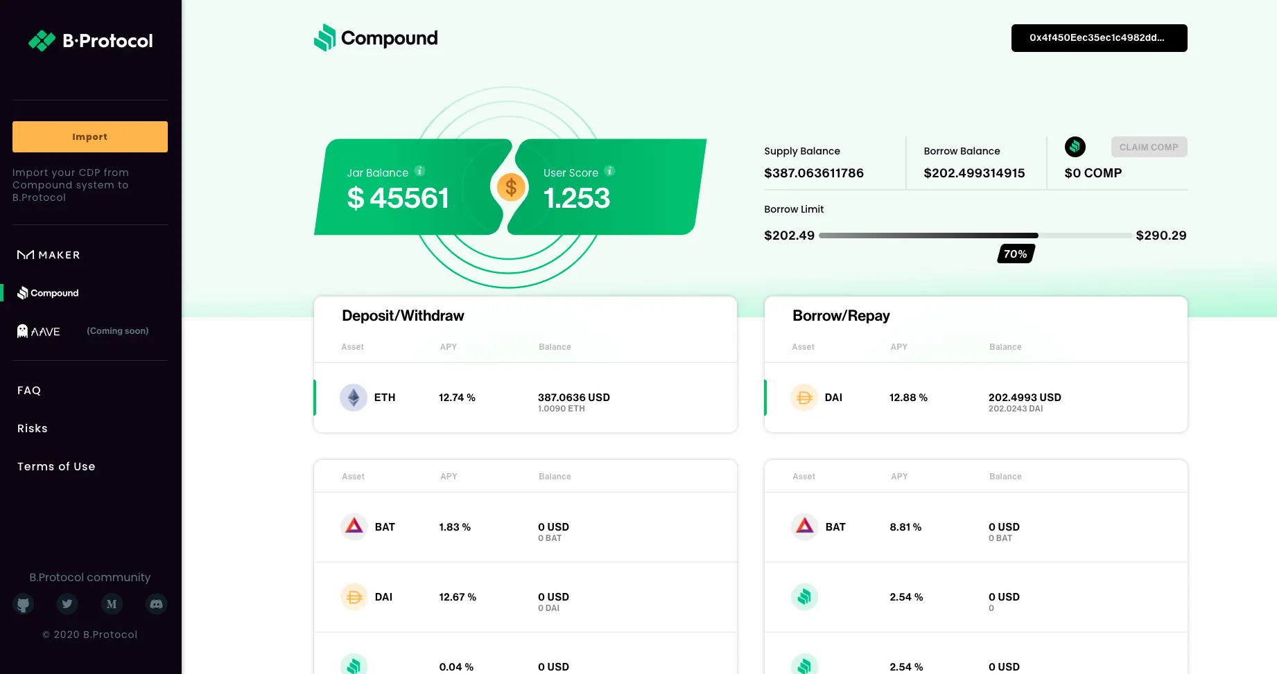 We have just launched our Compound integration that will enable Compound users to make better use of their funds - getting their slice of the liquidation proceeds while keep on doing the exact same thing with their funds on the platform. We believe that this integration will increase B.Protocol usage in a very significant way. Compound users, after connecting their MetaMask, can use the Import button on the B.Protocol app page to migrate their funds from Compound to be managed via B.Protocol. They will gain bScore - which will let them also vote on the next protocol update, on top of getting their liquidations profits according to their bScore.