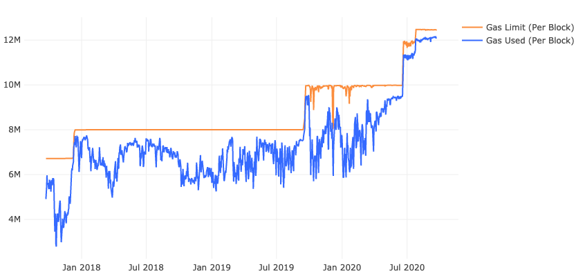 Another important element to consider is how Ethereum has a network-wide gas limit for its blocks, too. This limit bounds the amount of transactions that can be included in a block. Miners have voted on raising this block size limit repeatedly over time to meet growing demand. For instance, in June 2020 miners voted to raise the limit from 10 million to 12.5 million.