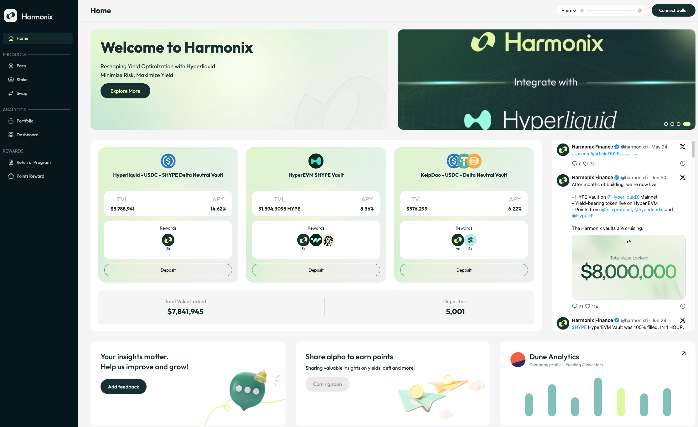 - Overview: HarmonixFi is a vault-based protocol where users can deposit assets to farm $HYPE and points for future airdrops. It focuses on yield farming and community-driven incentives.