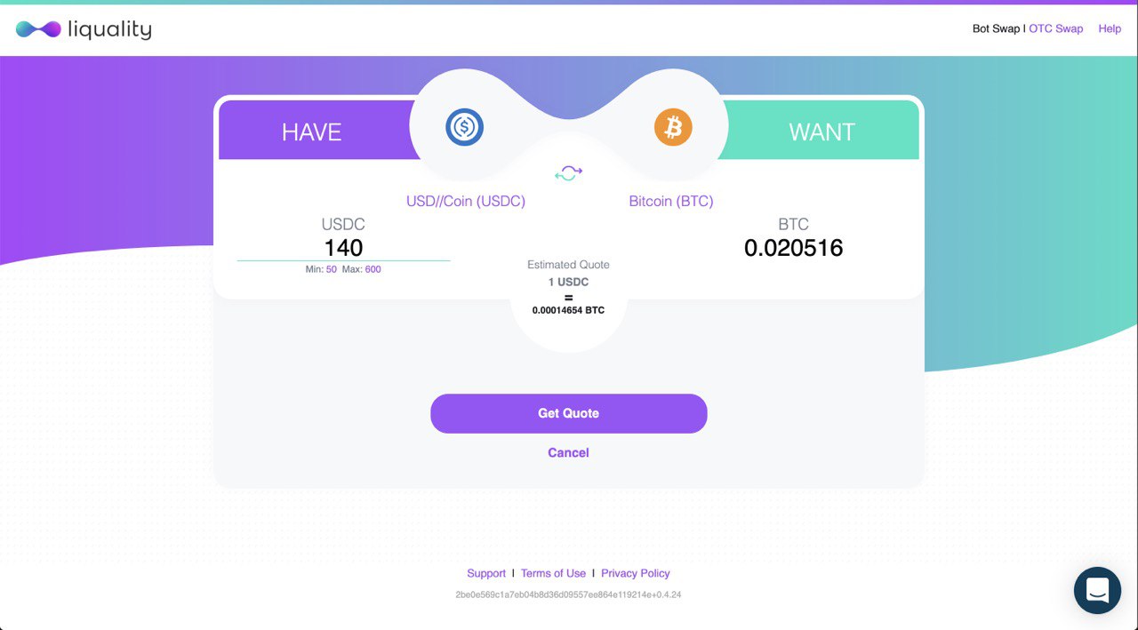 - The swap interface (https://liquality.io/swap/) that enables users to swap trustlessly across chains (e.g. BTC<>ETH, BTC<>DAI, BTC<>USDC)