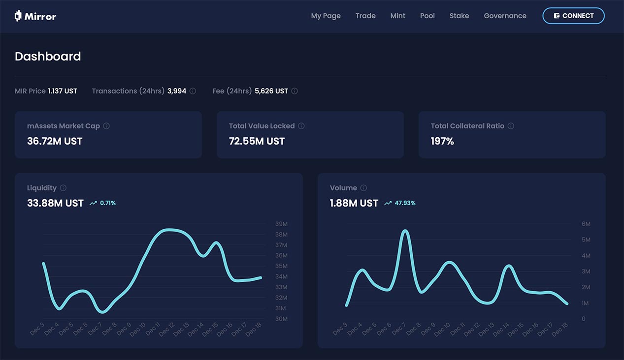 Our immediate goals are to improve usability for users both on the Terra and Ethereum blockchains, so we have been very active with our community to reflect suggested features. This includes incorporating dashboard metrics for Mirror-based statistics that the community can view, as well as understanding some of the initial points of friction and how to attract more liquidity.