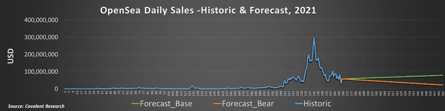 The following chart shows OpenSea’s daily historic and forecast US Dollar sales for 2021: