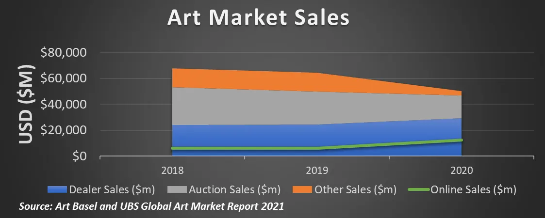 Art market sales declined 22.2% between 2019 and 2020, from $63.8 billion to $50 billion, with dealer sales declining 20.0% from $29.3 billion to $24.4 billion, and auction sales declining 30.2% from $25.2 billion to $17.6 billion. It is no surprise that during COVID-19 times, the one sales bright spot in sales comes from online channels that more than doubled from $6 billion to $12.4 billion.