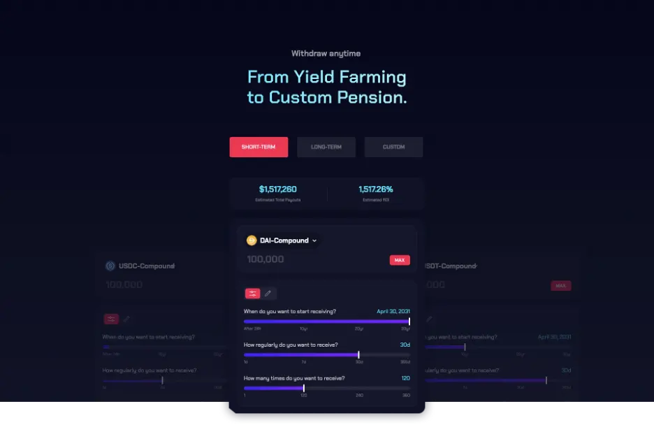On the user side, considering the market’s feature where short-term investors are the majority, the protocol provides customization of investing conditions so that users can use the product upon their preference - From using our protocol as yield farming to replacement of the real pension instrument.