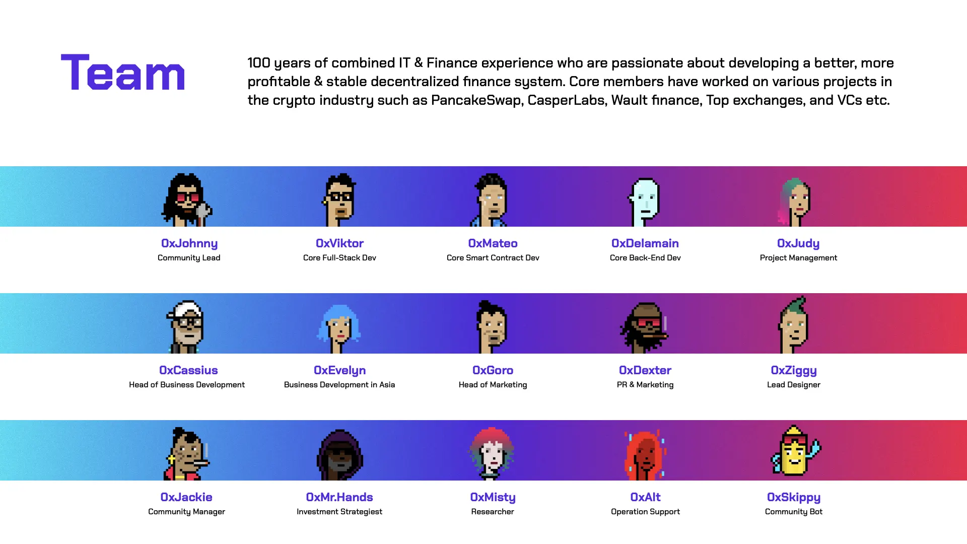 By the time the picture of Punk Protocol came alive, I started to gather contributors from different parts of the world. Designers, product managers, developers, marketers, market analysts, and business dev. I, myself, have been involved with the blockchain industry since 2017. 0xMateo, one of the core developers, has previously contributed himself to projects like PancakeSwap, Wault Finance, and CasperLabs. Each and every contributor of Punk Protocol stands out in the field of their responsibility and industry leaders with their own expertise. There is definitely a common value that everyone agrees on and that would be the ‘decentralization of finance’. (Sometimes we are often misunderstood as anonymous projects because of nicknames, We use nicknames to strengthen our brand concept and focus on products, but we are not seeking anonymity.)