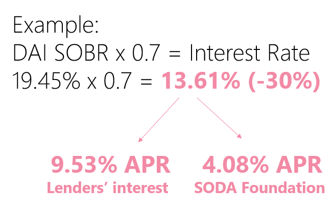 Interest rates for borrowing crypto on SODA are always 30% lower than the market-weighted average SOBR (Secured On-demand Borrowing Rate). Our partners LoanScan.io are calculating SOBR using the on-chain data. SODA smart contract sets the interest rate 30% lower based on the current SOBR rate (market-weighted average).